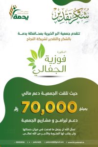 #شكر_وتقدير لشريكة النجاح #الدكتورة #فوزية_الجفالي حيث تلقت #الجمعية دعم مالي بمبلغ 70,000 ألف ريال دعم لبرامج و مشاريع #الجمعية. نسأل الله أن يجعل ما قدمت في ميزان حسناتها وأن يكتب لها المثوبة والأجر من الله تعالى.