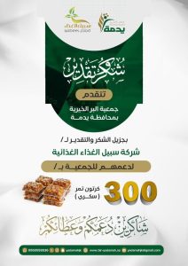 لـ جمعية البر | 31/03/2026 | الاخبار | دعم من شركة سبيل الغذاء الغذائية تتقدم #جمعية #البر الخيرية بمحافظة #يدمة بخالص الشكر والتقدير لشركة #سبيل الغذاء لدعمهم #للجمعية بعدد (300) كرتون #تمر، سائلين الله عز وجل أن يجعلها في موازين حسناتهم وأن يجزيهم الأجر والثواب.